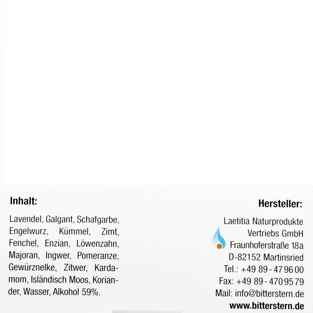 - Der hohe Alkoholgehalt des Bitterstern® erübrigt den Einsatz künstlicher Konservierungsstoffe und verbessert dessen Aufnahme über die Schleimhäute.
