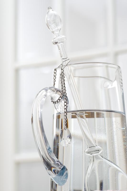 Das praktische Bügelkettchen (Edelstahl) bietet sicheren Halt für die VitaJuwel – Edelsteinphiole. Durch die Fixierung des Edelsteinstabes am Karaffengriff wird die Gefahr eines versehentlichen Glasbruchs minimiert.