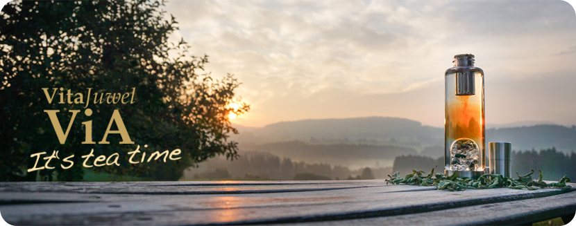 - die Trinkflasche VIA mit Edelsteinmodul “Tea Time” (Moosachat und Bergkristall)