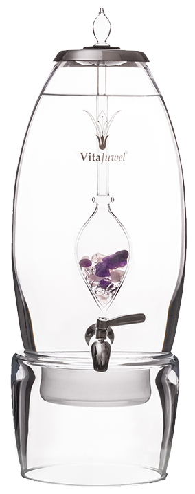 Denken Sie ab sofort in größeren Dimensionen! Mit unserem neuen VitaJuwel Wasserspender “grande” sitzen Sie garantiert nie auf dem Trockenen. Er fasst sagenhafte 7 Liter und erscheint in völlig überarbeitetem Design. Wie in der Karaffe era wird die Edelsteinphiole hier vom Deckel gehalten. Der Wasserspender lässt sich wunderbar auffüllen, ohne den Deckel dabei abnehmen zu müssen. Und das Beste daran ist, Sie können ihn mit Ihrer normalen Edelsteinphiole kombinieren! Somit stehen Ihnen alle Varianten unserer Phiolen zur Verfügung. Die Einsatzmöglichkeiten des VitaJuwel grande sind grenzenlos: Mit seinen platzsparenden 20 cm Durchmessern fügt er sich in jede noch so kleine Küche oder Wasserbar. Ob zu Hause im Kreis der Familie, in Spas, Hotels, Restaurants, Büros oder Wartezimmern, VitaJuwel grande macht überall eine gute Figur und versorgt gesundheits- und stilbewusste Menschen mit erfrischendem Edelsteinwasser.